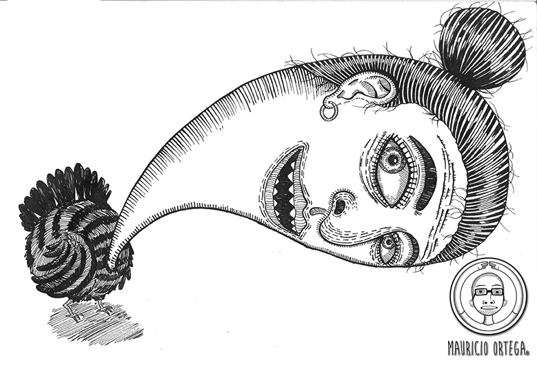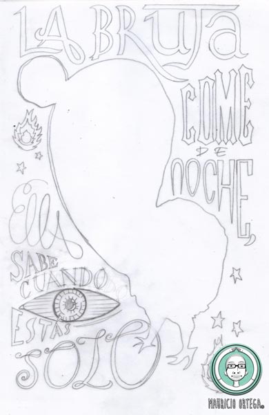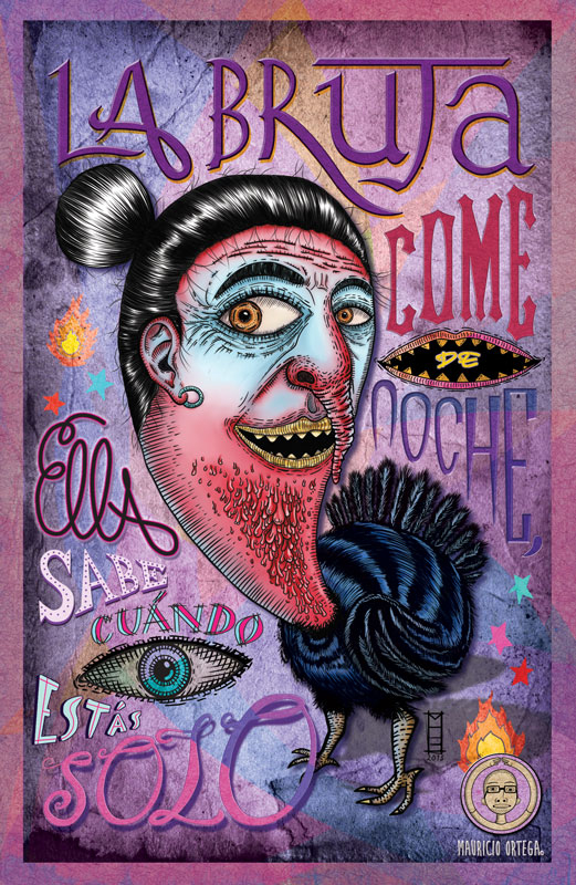 En esta ilustración me he enfocado en La Bruja Guajolote, un ser que por sus características físicas me atrae de manera singular, una señora de edad adulta, la cual puede quitarse las piernas y sustituirlas por las de un guajolote, adquiriendo una forma extraña y terrorífica. Siempre saliendo por la noche buscando personas para alimentarse, teniendo como su alimento favorito niños recien nacidos. Otra forma en la que se les relaciona son con las llamadas "bolas de fuego" que se ven bolando en los alrededores de los cerros y entre su maleza.