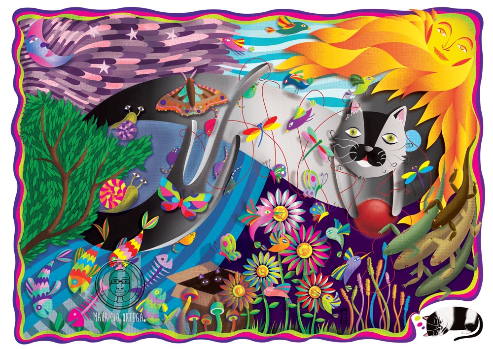 Esta ilustración esta inspirada en una gatita de 10 años que vive con nosotros desde que nacio, su nombre es Chopi. A mi manera de ver este es una parte de su mundo, un mundo salvaje, lleno de aventuras y juegos que solo ella entiende y disfruta.